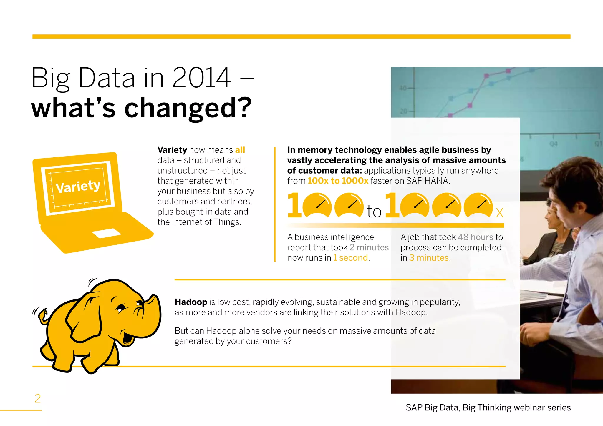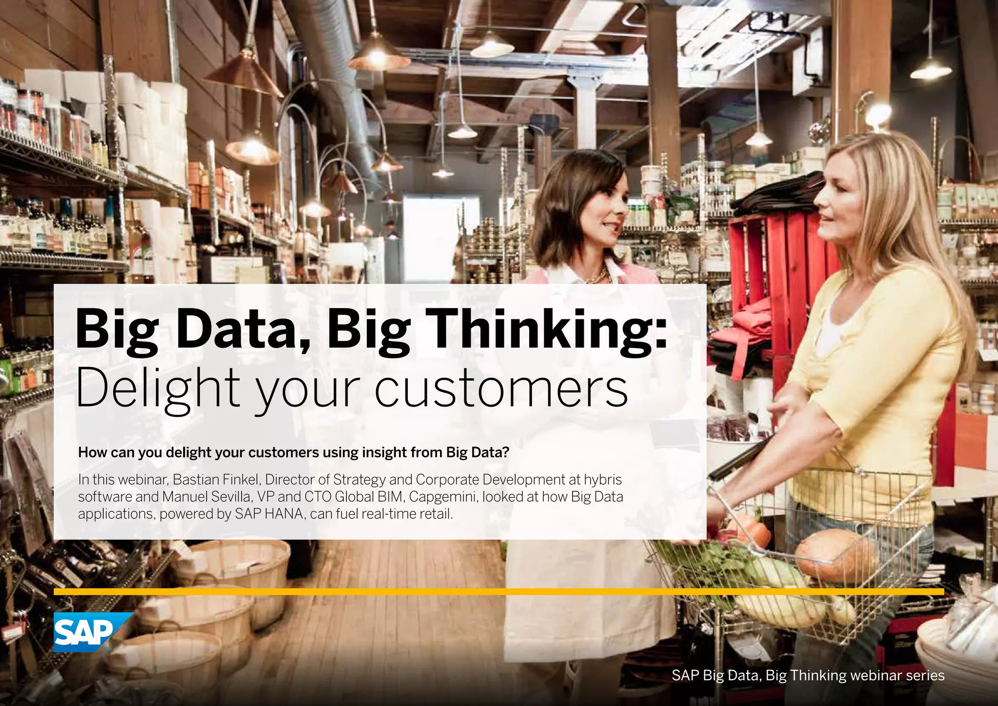 The document discusses the application of big data in enhancing customer engagement and optimizing retail operations, focusing on a webinar featuring experts from hybris software and capgemini. It highlights how using SAP HANA technology can accelerate data analysis and improve customer insights across various channels, ultimately driving revenue growth. The content emphasizes the importance of integrating structured and unstructured data to create personalized customer experiences and better marketing strategies.