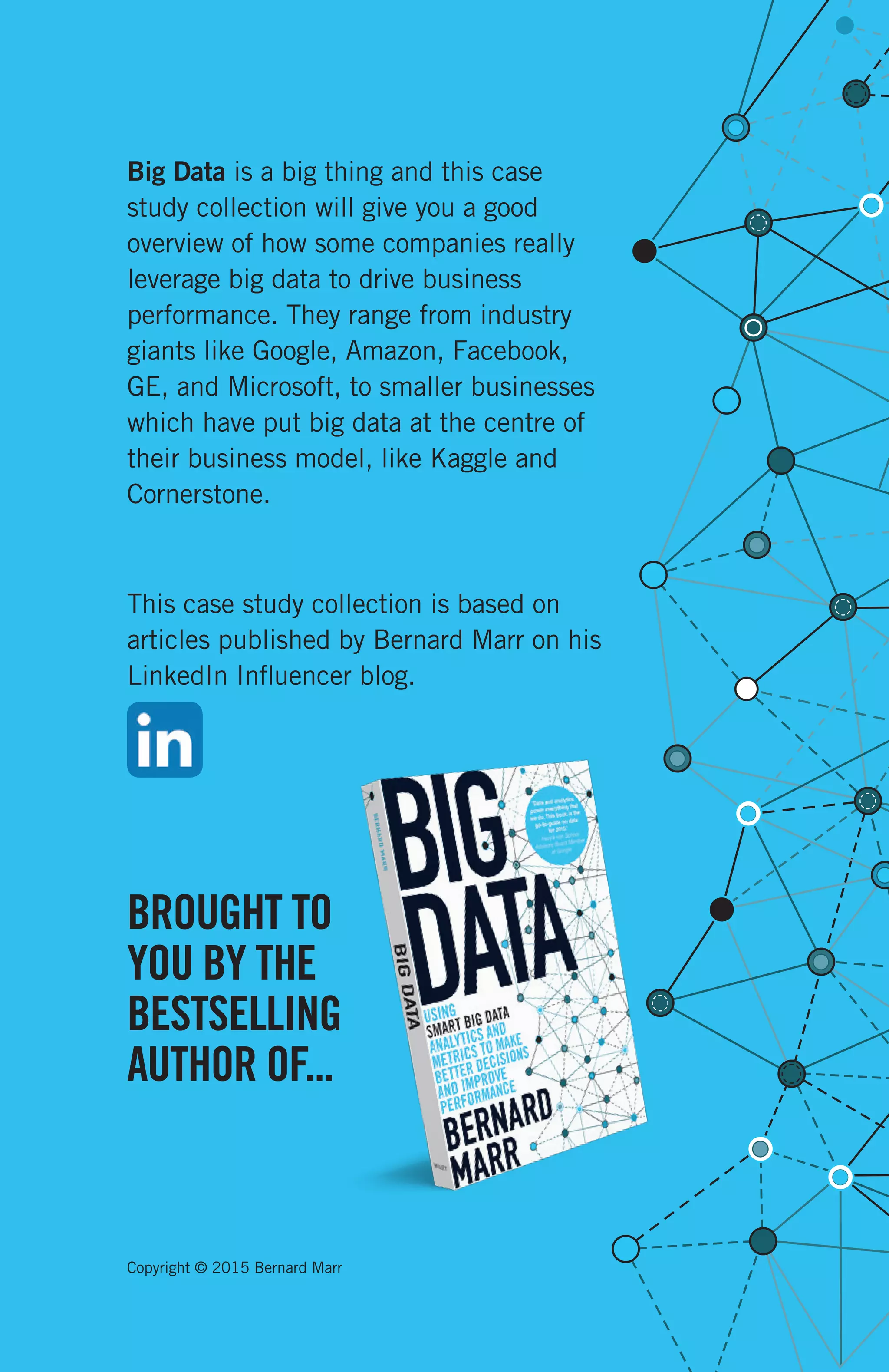 This document provides case studies on how several companies leverage big data, including Google, GE, Cornerstone, and Microsoft. The Google case study describes how Google processes billions of search queries daily and uses this data to continuously improve its search algorithms. The GE case study outlines how GE collects vast amounts of sensor data from power turbines, jet engines, and other industrial equipment to optimize operations and efficiency. The Cornerstone case study examines how Cornerstone uses employee data to help clients predict retention and performance. Finally, the Microsoft case study discusses how Microsoft has positioned itself as a major player in big data and offers data hosting and analytics services.