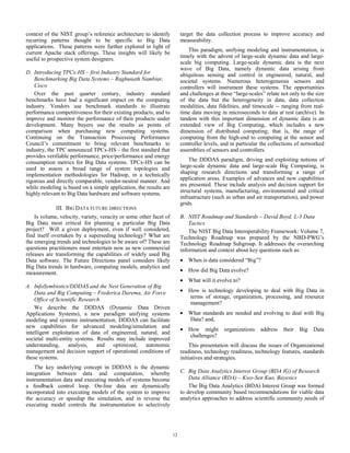 This document summarizes discussions from a workshop organized by the National Institute of Standards and Technology's (NIST) Big Data Public Working Group. The workshop included four panels that discussed: 1) the current state of big data technologies; 2) future trends in big data hardware, computing models, analytics and measurement; 3) methods for improving big data sharing and collaboration; and 4) security and privacy concerns with big data. The panels featured presentations on topics such as big data reference architectures, use cases, benchmarks, data consistency issues, and approaches for enabling secure big data applications while preserving privacy.