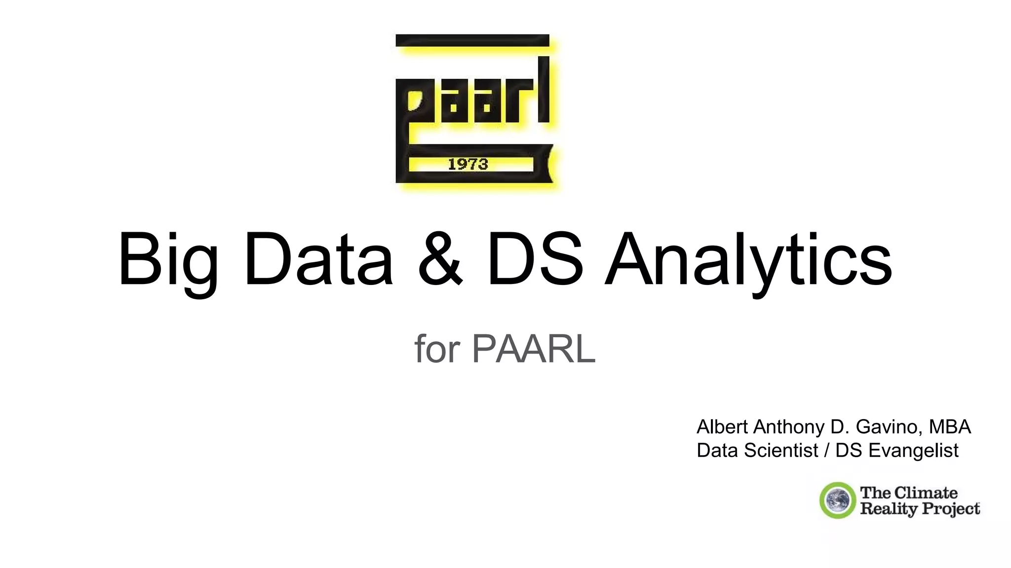 The document discusses the importance of big data and data science in enhancing library services, emphasizing the need for institutional culture, cost considerations, and training in data analytics programs. It highlights various challenges in data sharing, data governance, and the potential applications of big data across different fields such as agriculture and healthcare. Additionally, it outlines the skills required for building a data science team and the implications of the data privacy act.