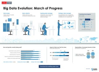 The document discusses the evolution of big data and its growing impact on business processes and decision-making over the past five years. It highlights the importance of having well-defined data-management strategies to fully leverage collected data, categorizing organizations into data wasters, collectors, aspiring data managers, and strategic data managers. Overall, it notes significant advancements in utilizing big data to improve customer service and identify new opportunities.