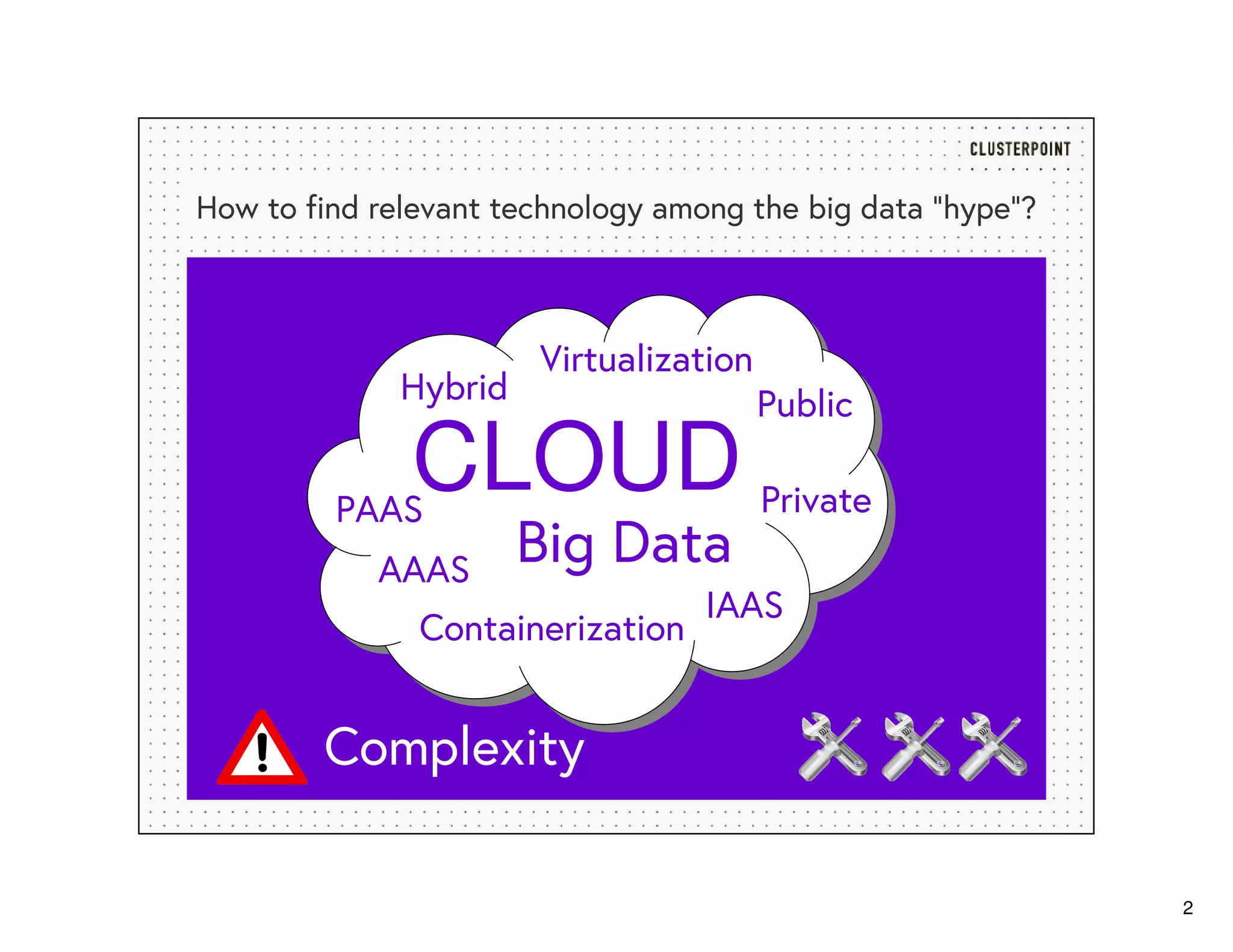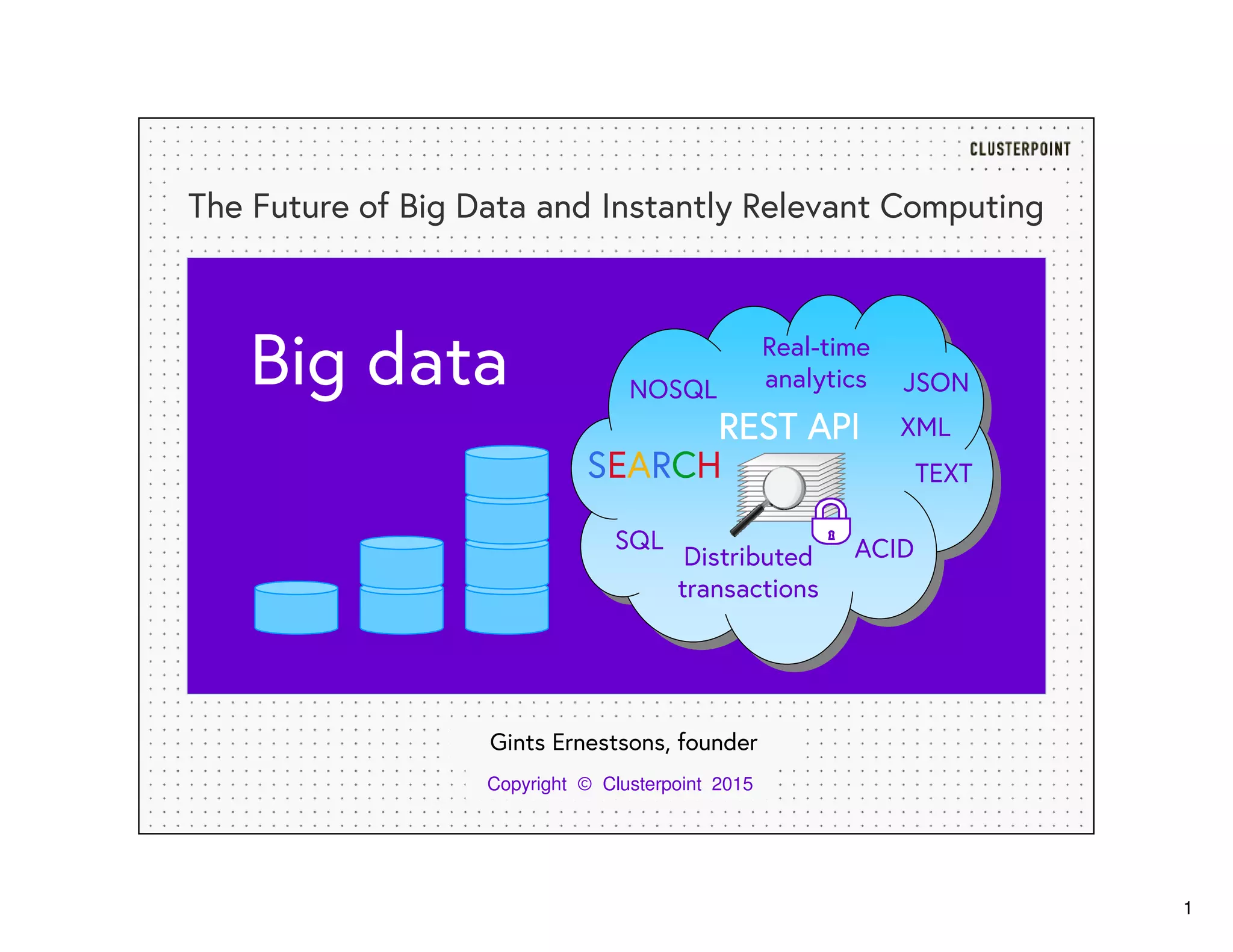 The document discusses the future of big data and the necessity for instantly relevant computing, emphasizing the importance of managing both structured and unstructured data effectively. It highlights various technologies that can help with real-time analytics and the significance of relevance ranking to combat information overload. Additionally, it outlines the capabilities of Clusterpoint's database software in providing cost-efficient, scalable solutions tailored for business needs.