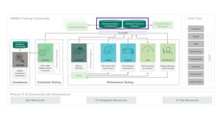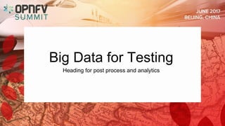 The document discusses big data analytics in the context of testing and performance analysis, featuring speakers from ZTE Corporation and Cisco who highlight their respective projects and interests. It provides an overview of the current state of test data, analytics methods using the pnda.io platform, and expectations for future development within the community, emphasizing the importance of traceability and anomaly detection. Additionally, it outlines use cases from other domains and sets a roadmap for integrating pnda analytics into the OPNFV infrastructure.