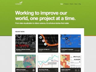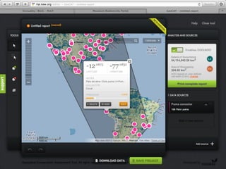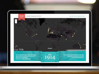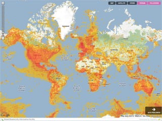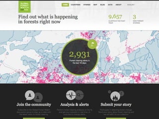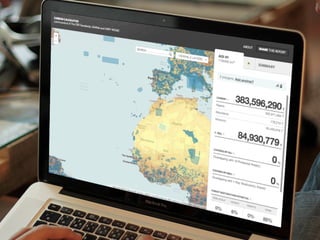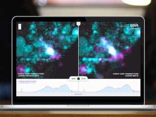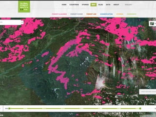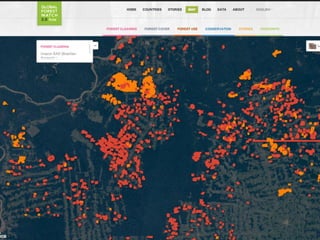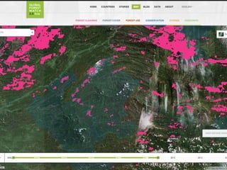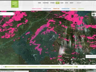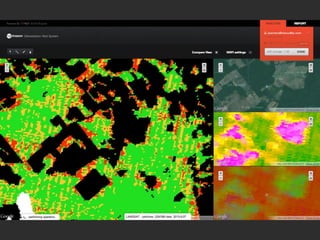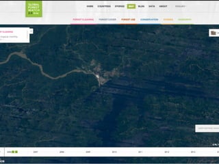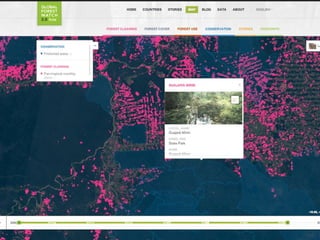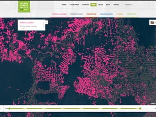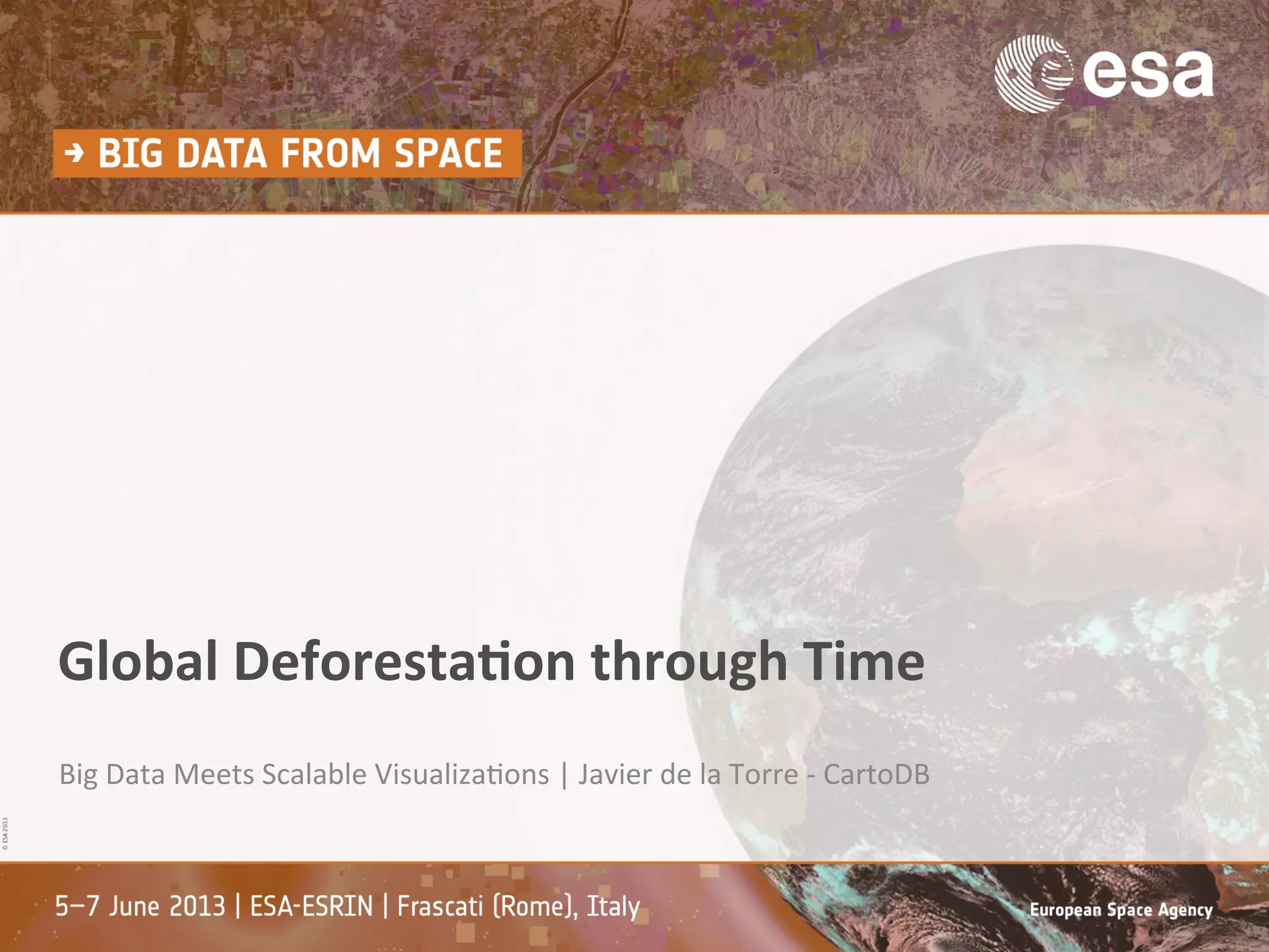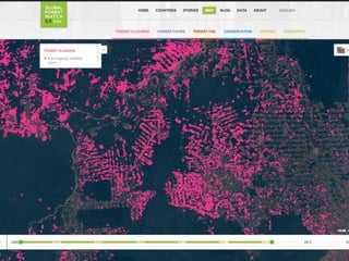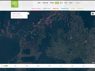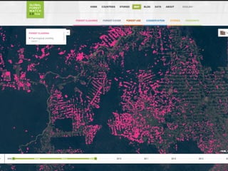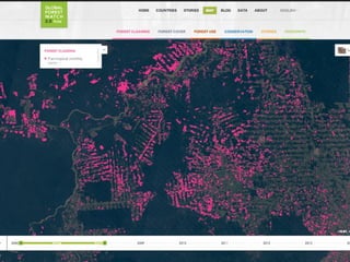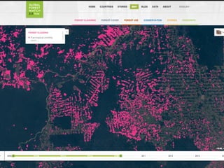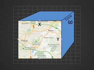 The document discusses using CartoDB and Torque to create geo-temporal visualizations of global deforestation over time using big data. It describes how datacubes can be used to analyze and summarize multidimensional data binned by variables. The document provides an example of aggregating postal office location and construction date data into a grid to visualize counts and dates over space and time in a compact JSON format that can be transferred to a browser. Geo-temporal visualizations and data cubes allow understanding how spatial data changes over millions of records.