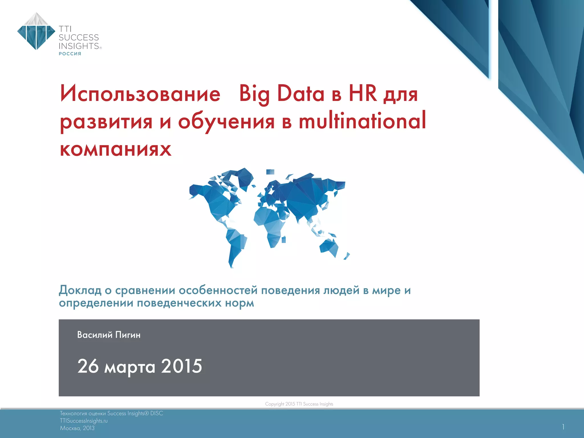 Документ обсуждает использование методологии DISC для оценки стилей поведения и взаимодействия сотрудников в международных компаниях, акцентируя внимание на культурных различиях и их влиянии на командную работу. Приводятся статистические данные о респондентах из разных стран и методах обеспечения качества данных. Также рассматриваются области практического применения DISC, включая управление, маркетинг и межкультурные коммуникации.