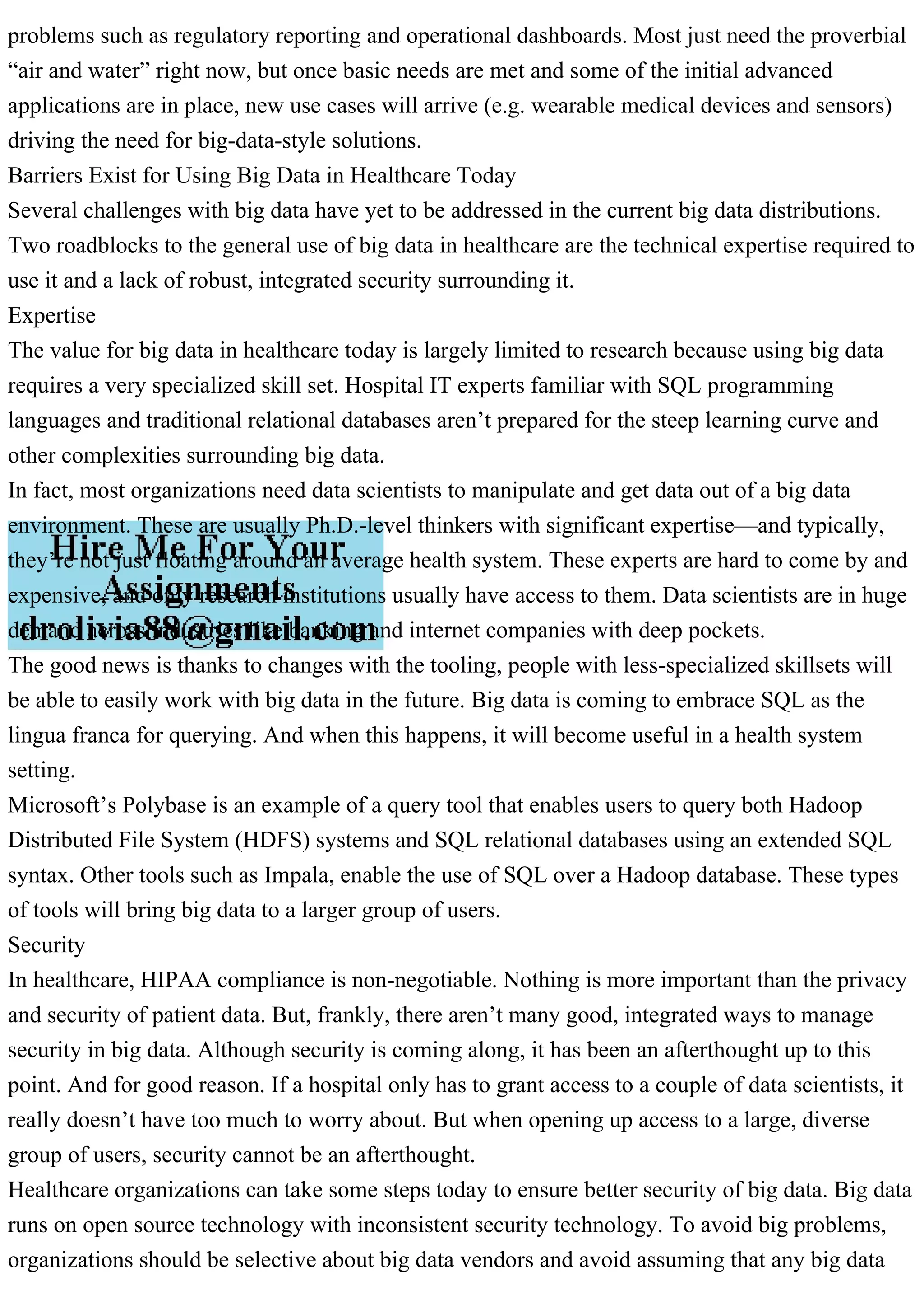 This document discusses the current state and future prospects of big data in healthcare, emphasizing its potential and challenges. While healthcare systems are beginning to harness big data, many still meet their needs through traditional relational databases, with obstacles such as technical expertise and data security remaining significant. The document highlights future use cases, including predictive analytics and genomics, suggesting that as technology evolves, big data will become increasingly vital for improving patient care and analytics capabilities.