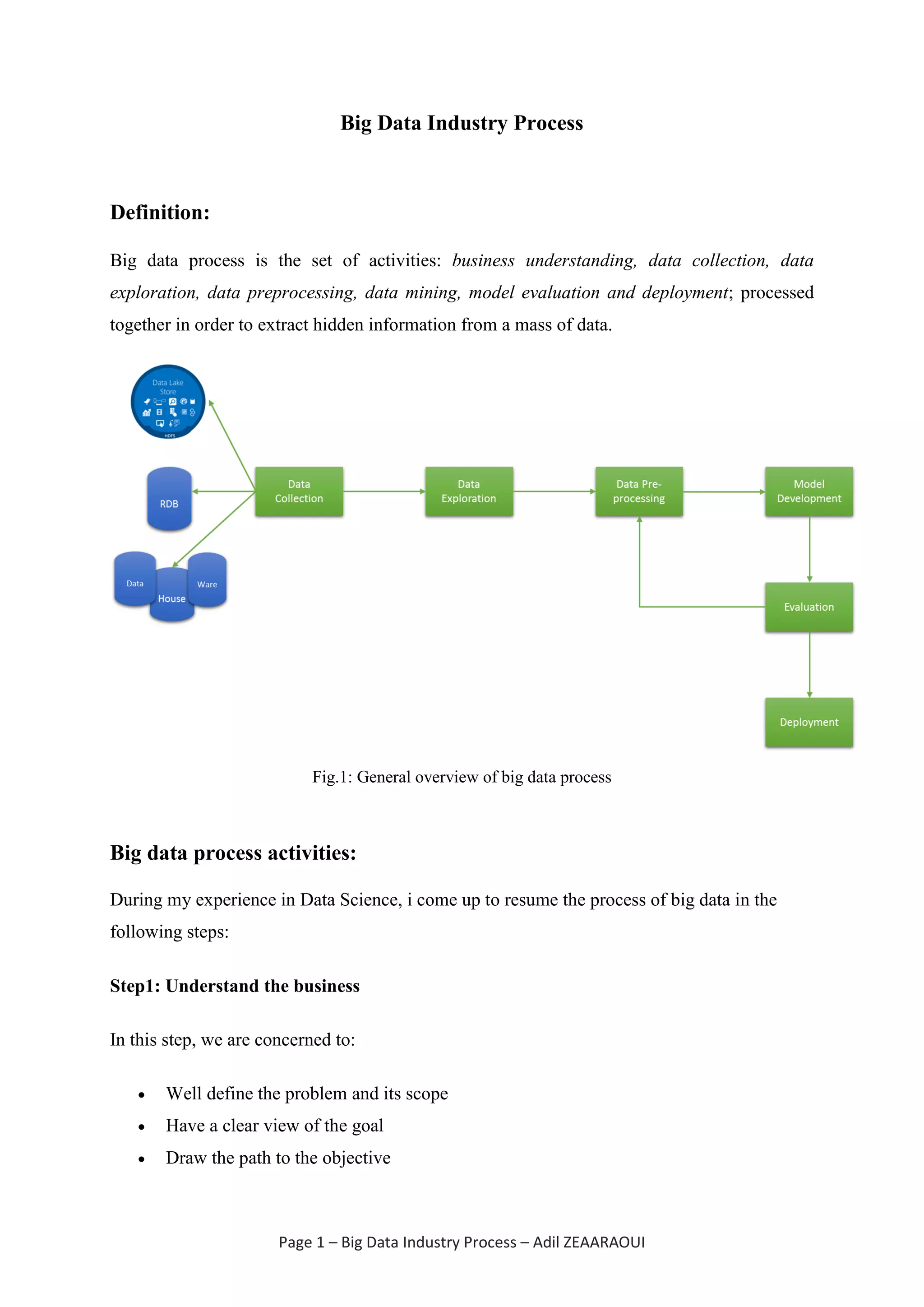 The document outlines the big data industry process, which includes steps such as business understanding, data collection, data exploration, data preprocessing, data mining, and model evaluation and deployment. It emphasizes the importance of each step, particularly data preprocessing, which can account for up to 90% of the overall process. The ultimate goal is to extract valuable insights from large data sets through a systematic approach.