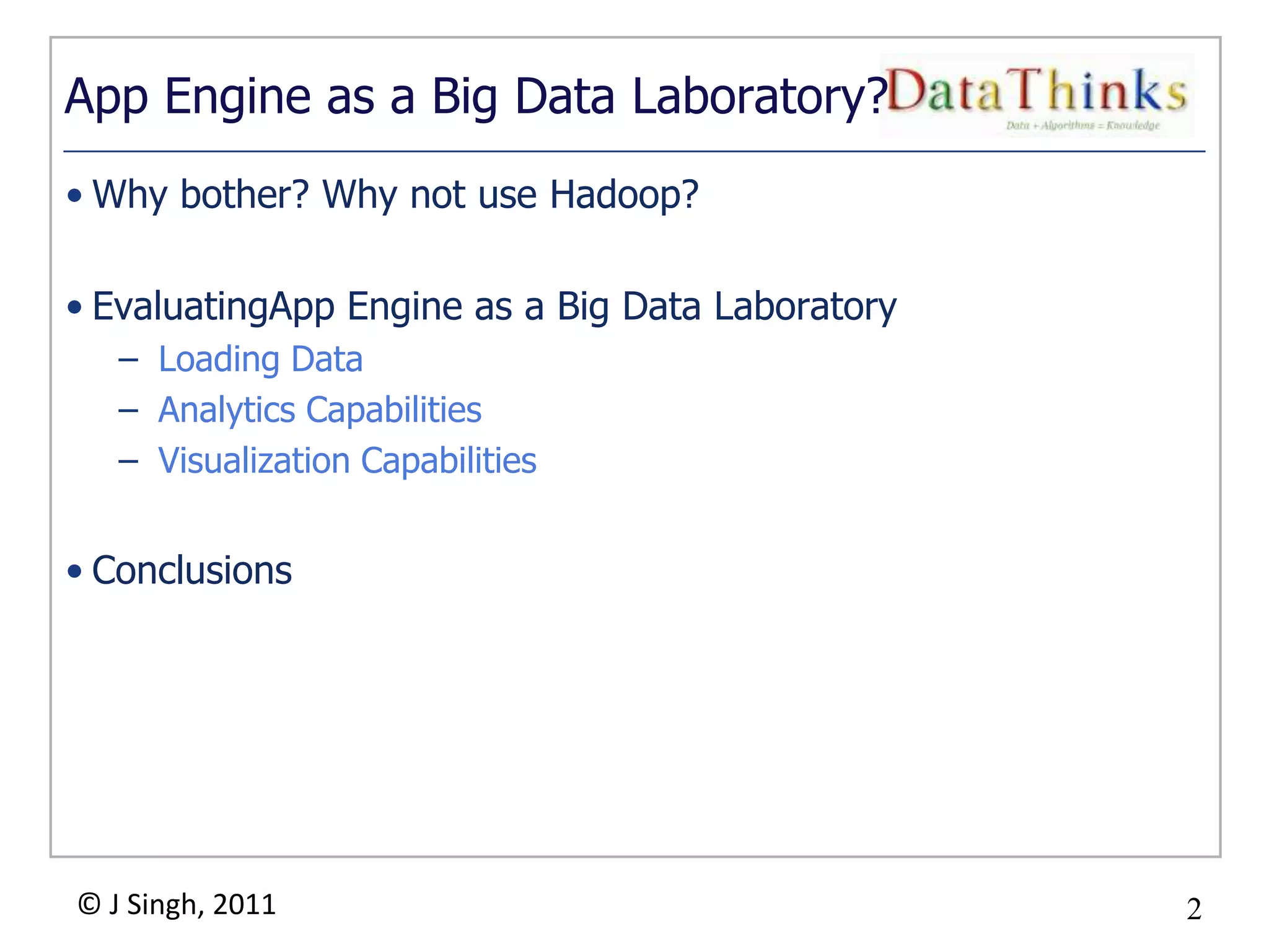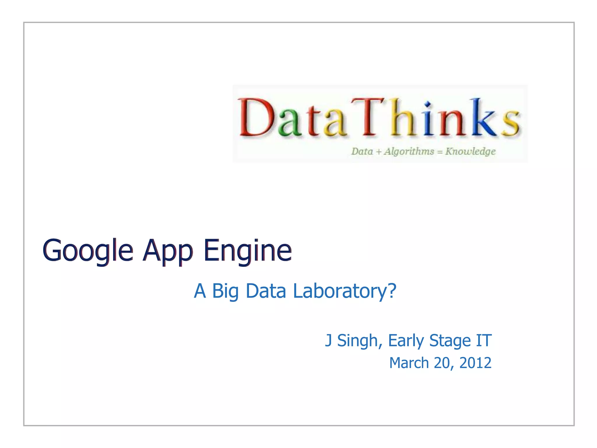 The document evaluates Google App Engine (GAE) as a potential platform for handling big data analytics, contrasting it with Hadoop. It discusses the ease of use with no installation or configuration required, the capabilities for data loading, analysis using libraries like numpy and scipy, and various visualization options. The conclusion suggests GAE offers a rich set of features, albeit with limitations such as the lack of pig and hive environments.