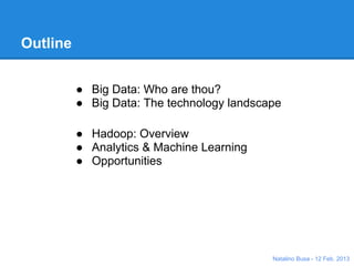 The document discusses the landscape of big data technology, its applications, and associated challenges, highlighting the shift from structured to unstructured data. It covers various systems and techniques, including Hadoop, analytics, machine learning, and stream processing for real-time data analysis. Additionally, it identifies opportunities for businesses to leverage big data for predictive analytics, customer segmentation, and personalized marketing.