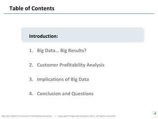 The document discusses how big data can be used for customer profitability analytics. It describes customer profitability analysis as measuring the contribution each customer makes to overall profits and key profit drivers, providing a customer-level version of a company's income statement. While the concepts of customer profitability metrics seem simple, accurately calculating them can be complex for organizations with multiple business units. The document explores how big data and advanced analytics could help improve customer profitability analysis.