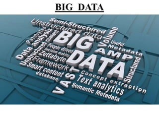 This document provides an overview of big data, including its definition, characteristics, sources, tools used, applications, benefits, and impact on IT. Big data is a term used to describe the large volumes of data, both structured and unstructured, that are so large they are difficult to process using traditional database and software techniques. It is characterized by high volume, velocity, variety, and veracity. Common sources of big data include mobile devices, sensors, social media, and software/application logs. Tools like Hadoop, MongoDB, and MapReduce are used to store, process, and analyze big data. Key applications areas include homeland security, healthcare, manufacturing, and financial trading. Benefits include better decision making, cost reductions