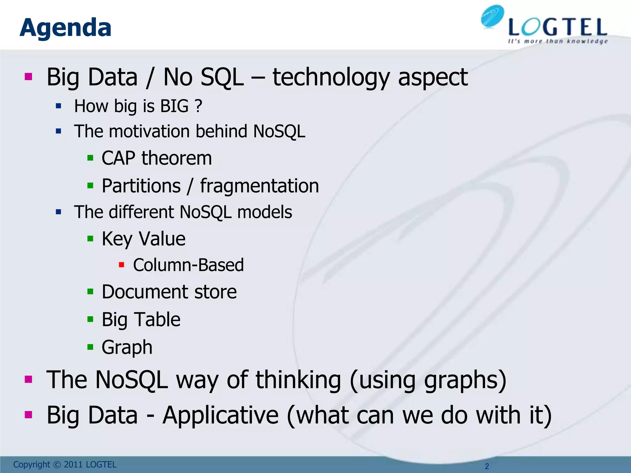 The document provides an overview of NoSQL and big data technologies. It begins with defining big data and the challenges it poses that require new techniques compared to traditional databases. It then discusses the CAP theorem and how NoSQL databases sacrifice consistency or availability to achieve scalability. The document outlines several NoSQL data models and examples like key-value, columnar, document and graph databases. It also discusses distributed systems like BigTable, HBase and PNUTS. Finally, it provides an example of how graph databases can model relationships compared to the need for joins in relational databases.