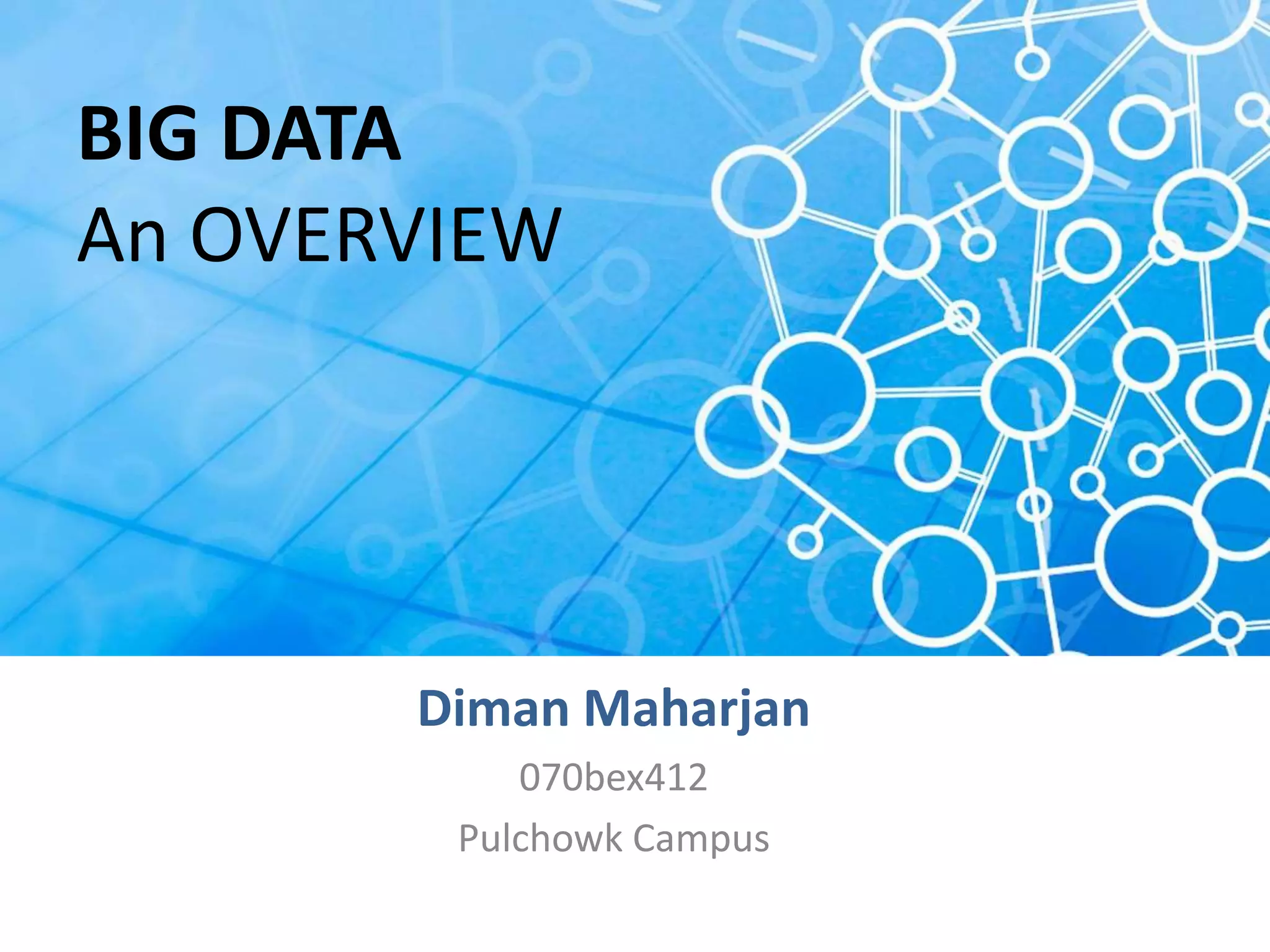 This document provides an overview of big data, including its characteristics and how it is analyzed. Big data refers to extremely large data sets that are difficult to process using traditional methods due to their size and complexity. It is characterized by 3 V's - volume, variety and velocity. Examples are provided of how companies like Facebook and Walmart generate massive amounts of diverse data in real time. Distributed systems and data scientists are key to extracting useful insights from big data through techniques like machine learning and deep learning.
