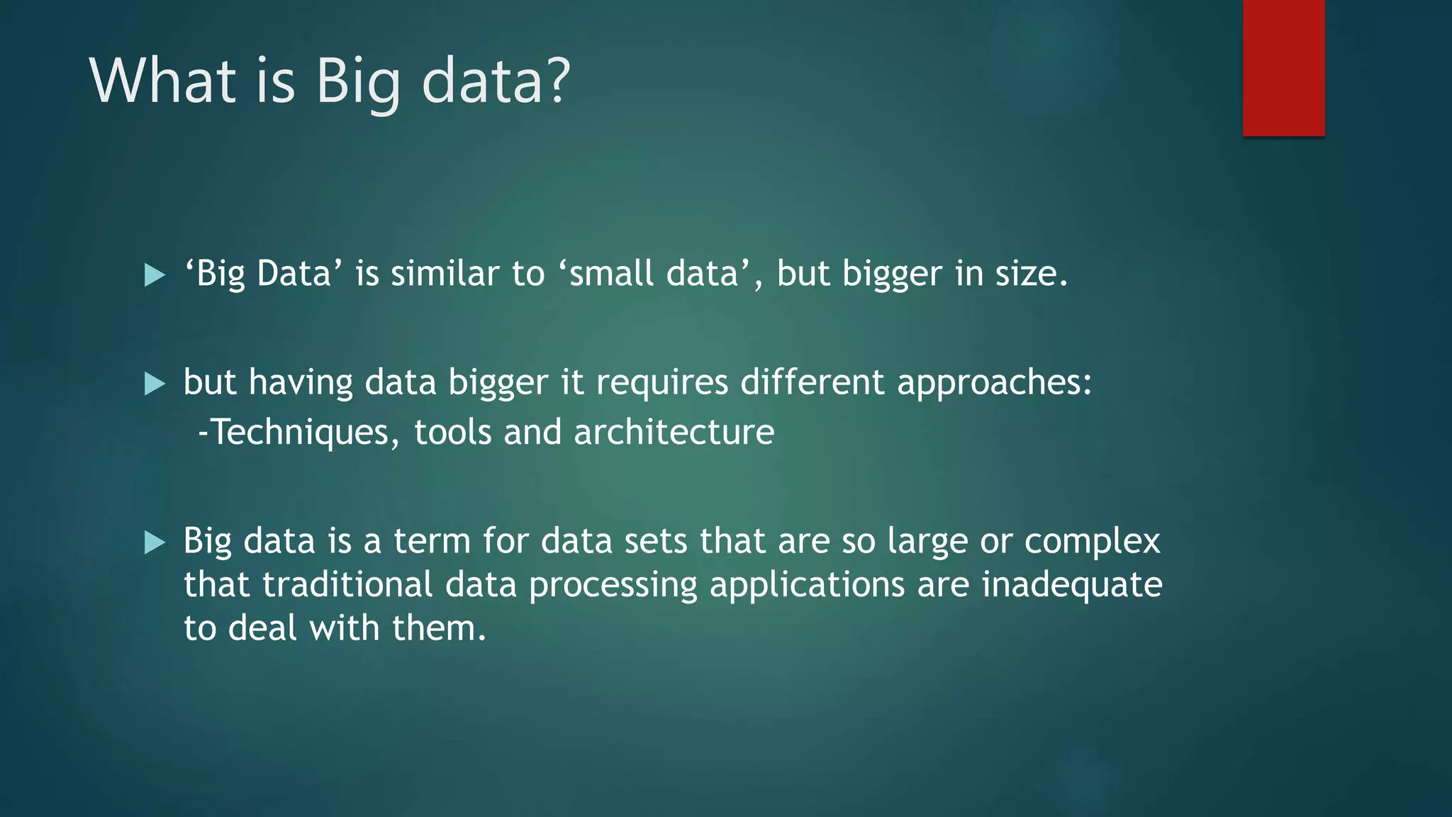 The document discusses big data, including what it is, sources of big data like social media and stock exchange data, and the three Vs of big data - volume, velocity, and variety. It then discusses Hadoop, the open-source framework for distributed storage and processing of large datasets across clusters of computers. Key components of Hadoop include HDFS for distributed storage, MapReduce for distributed computation, and YARN which manages computing resources. The document also provides overviews of Pig and Jaql, programming languages used for analyzing data in Hadoop.