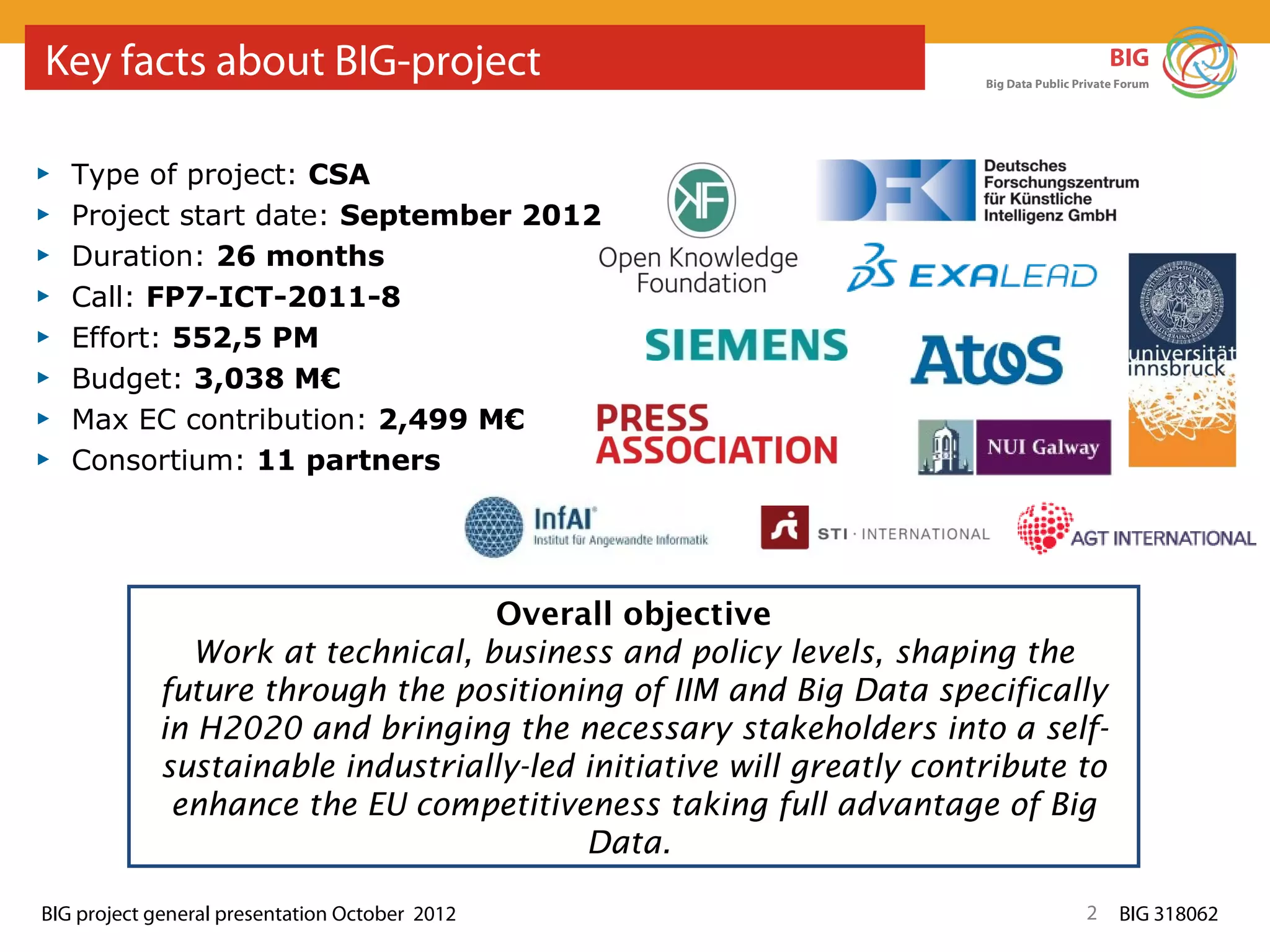The BIG project aims to establish a public-private forum on big data in Europe. It will bring together stakeholders from industry and research to develop a shared vision for big data in Europe over the next 5-10 years. The project will identify existing big data technologies, understand how big data can be applied across sectors, and develop roadmaps for specific sectors. It seeks to increase European competitiveness and position big data research priorities in the EU framework program Horizon 2020. The project is coordinated across four work packages covering management, strategy and operations, dissemination, and establishing the public-private forum.