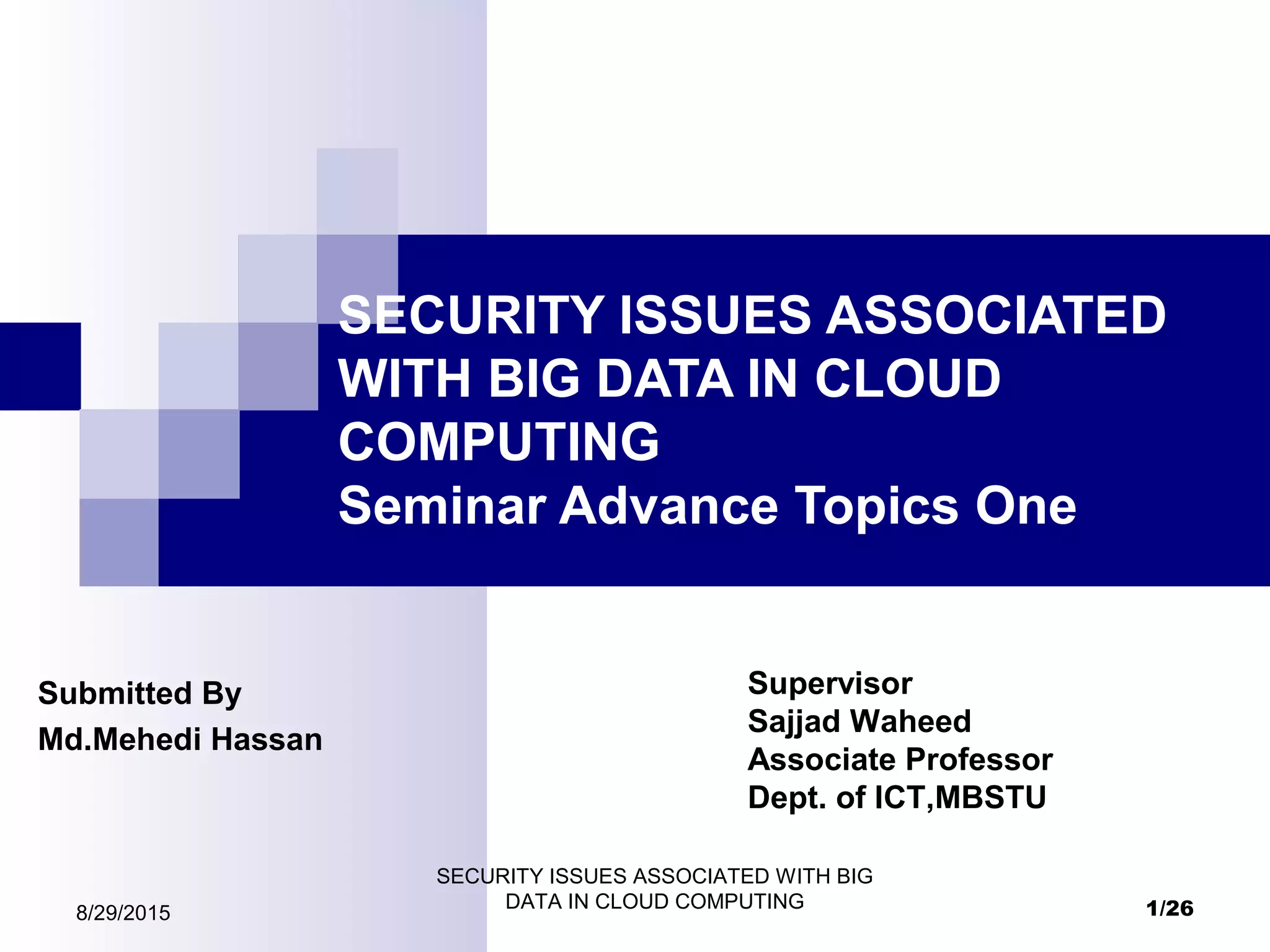 This document outlines security issues associated with big data in cloud computing. It begins with introductions to big data, cloud computing, and Hadoop. It describes how big data is related to cloud computing and discusses advantages and applications of big data. The document then discusses security issues at the network, authentication, and data levels. It proposes several approaches to address these security issues, such as file encryption, network encryption, and access control. Finally, it discusses conclusions and opportunities for future work.