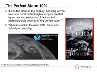 The document discusses how big data, increased data volumes, and weaknesses in security present a "perfect storm" risk scenario. It notes that while big data deployments are growing fast to realize business value, security is often not properly prioritized or implemented. This can allow breaches to go undetected. The document also outlines how data sources and volumes are expanding dramatically, while relevant security skills remain limited. Overall it argues that the confluence of these factors poses significant security challenges for organizations working with big data.