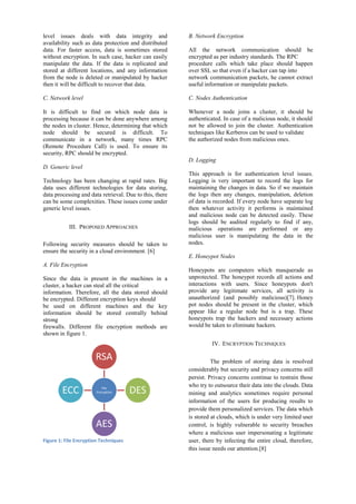 This document discusses big data security issues and encryption techniques. It begins with introducing the authors and providing an abstract about addressing security issues related to data integrity, confidentiality and availability. The main body then covers authentication, data, network and generic security challenges with big data as well as proposed solutions like encryption, logging and honeypot nodes. The document focuses on describing symmetric and asymmetric encryption algorithms including DES, AES, RSA and ECC. It compares the algorithms and concludes that encryption techniques can help secure big data stored in clouds, though current security levels may be improved.