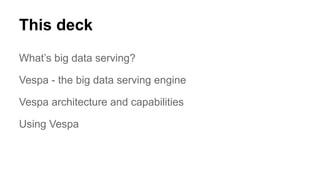 The document provides an overview of Vespa, an open-source big data serving engine designed for low-latency computations over large and evolving data sets. It discusses how Vespa facilitates real-time decision-making using AI and machine learning, demonstrating its application in scenarios like personalized recommendations, search functionalities, and finance predictions. Furthermore, it outlines Vespa's architecture, capabilities, and integration methods for machine learning models, highlighting its scalability and efficiency in handling high query rates.