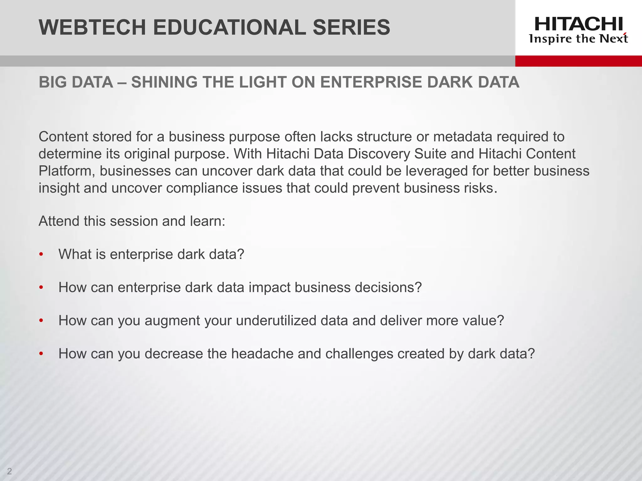 The document discusses the concept of enterprise dark data, which refers to unstructured information that organizations hoard due to its unknown value. It highlights strategies for uncovering and managing this data using Hitachi's data solutions, ultimately aiming to leverage dark data for improved business insights and compliance. The session covers the impact of dark data on business decisions and provides case studies from healthcare and financial services to illustrate its relevance.