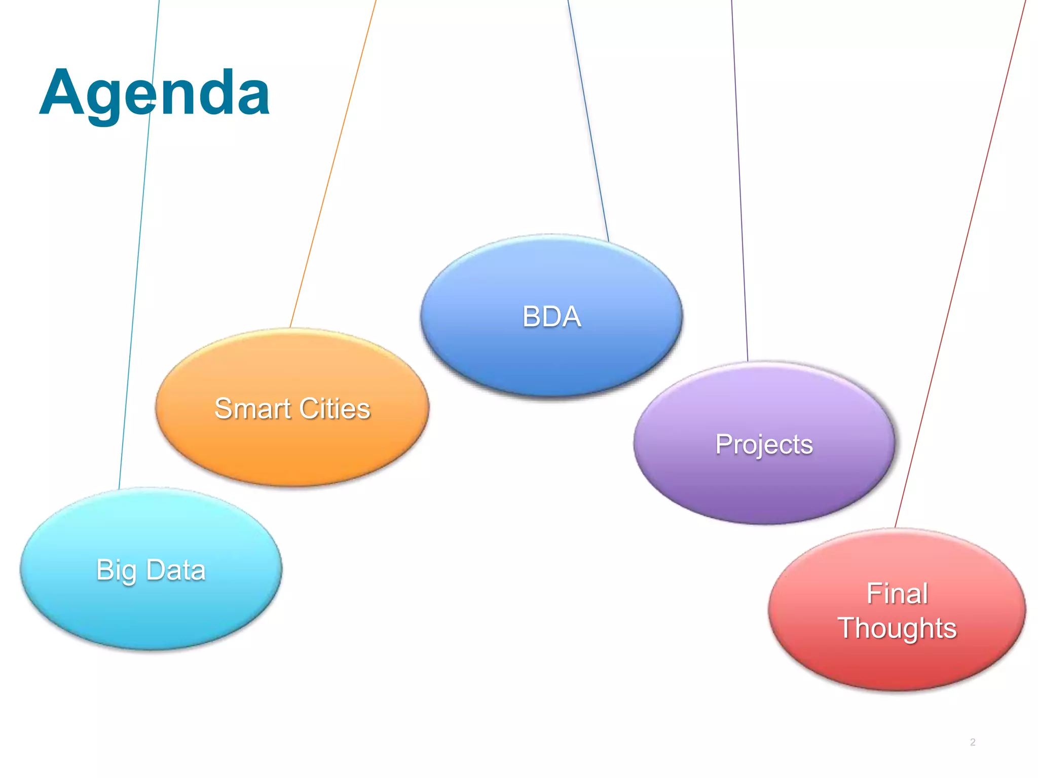 Big data and smart cities are closely related. Smart cities use big data and data analytics to optimize resource management, address issues like population growth and global warming, and manage tight budgets. Some examples of smart city projects utilizing big data include using sensors to manage intermittent bus lanes, powering electric buses through electric roads, and building green data centers to reduce energy usage. While mega smart cities promise advanced technology and services, they also face challenges of large budgets, construction delays, and defining success. Overall, big data and smart technologies have potential to improve city operations when applied strategically to address specific issues.