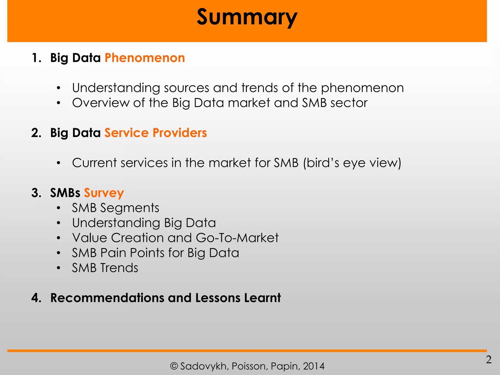 The document discusses the significance of big data for small and medium-sized businesses (SMBs) and the growth of the big data market, projected to reach $23.8 billion by 2016. It highlights key findings from a survey of 32 SMBs regarding their understanding of big data, associated challenges, and the value derived from data analytics services. Recommendations include providing scalable services and emphasizing the potential ROI of big data solutions for SMBs.