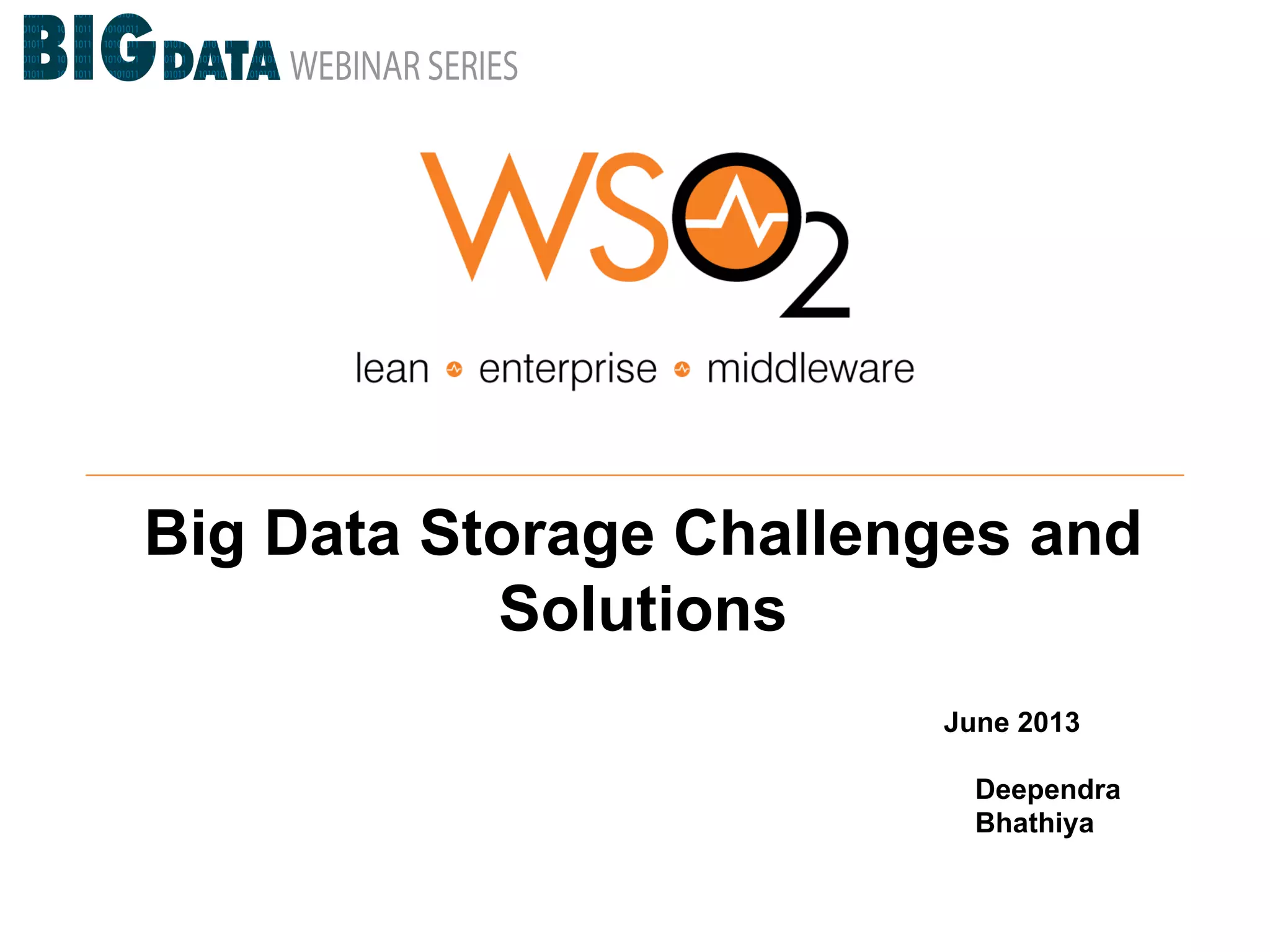 This document discusses big data storage challenges and solutions. It describes the types of data that need to be stored, including structured, semi-structured, and unstructured data. Optimal storage solutions are suggested based on data type, including using Cassandra, HBase, HDFS, and MongoDB. The document also introduces WSO2 Storage Server and how the WSO2 platform supports big data through features like clustering and external indexes. Tools for summarizing big data are discussed, including MapReduce, Hive, Pig, and WSO2 BAM for publishing, analyzing, and visualizing big data.