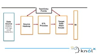 The document discusses big data testing strategies, emphasizing the importance of understanding big data applications and the challenges associated with testing them. Key areas include functionality, performance, and database testing, alongside necessary infrastructure considerations and the need for a skilled talent pool. It also highlights the significance of customer-centric approaches and agility in development when implementing big data solutions.