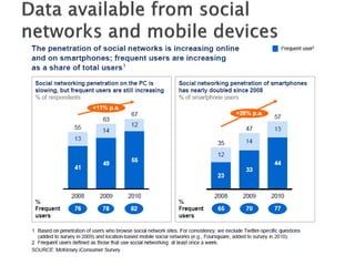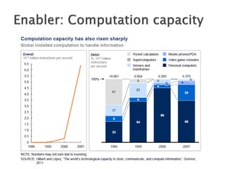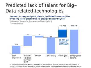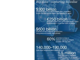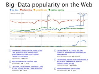 The document discusses big data, including what it is, key factors enabling its growth like increased storage and processing power, and techniques and tools used for working with big data like NoSQL databases, MapReduce, and Hadoop. It provides examples of using big data at large internet companies for personalized recommendations and detecting trends from user click streams.