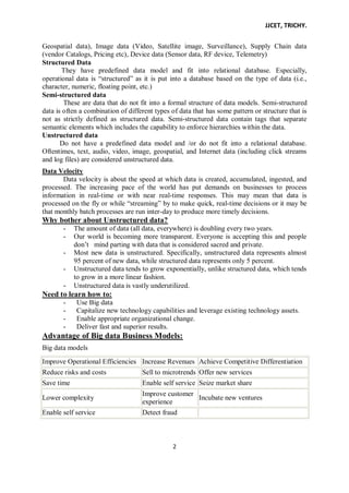 This document provides an overview of big data in various industries. It begins by defining big data and explaining the three V's of big data - volume, variety, and velocity. It then discusses examples of big data in digital marketing, financial services, and healthcare. For digital marketing, it discusses database marketers as pioneers of big data and how big data is transforming digital marketing. For financial services, it discusses how big data is used for fraud detection and credit risk management. It also provides details on algorithmic trading and how it crunches complex interrelated big data. Overall, the document outlines how big data is being leveraged across industries to improve operations, increase revenues, and achieve competitive advantages.