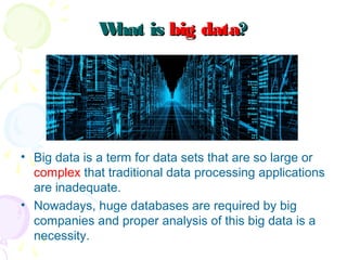 This document discusses visual analytics and big data visualization. It defines big data and explains the need for big data analytics to uncover patterns. Data visualization helps make sense of large datasets and facilitates predictive analysis. Different visualization techniques are described, including charts, graphs, and diagrams suited to simple and big data. Visualization acts as an interface between data storage and users. Characteristics of good visualization and tools for big data visualization are also outlined.