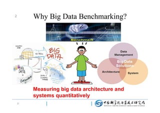 This document discusses BigDataBench, an open source project for big data benchmarking. BigDataBench includes six real-world data sets and 19 workloads that cover common big data applications and preserve the four V's of big data. The workloads were chosen to represent typical application domains like search engines, social networks, and e-commerce. BigDataBench aims to provide a standardized benchmark for evaluating big data systems, architectures, and software stacks. It has been used in several case studies for workload characterization and performance evaluation of different hardware platforms for big data workloads.