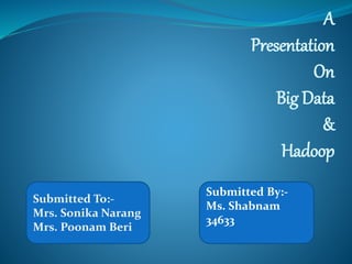 The presentation discusses big data as large and complex datasets that traditional processing methods struggle to handle, emphasizing the challenges in data capture, searching, sharing, analysis, storage, and visualization. It introduces Hadoop, an open-source software framework developed for distributed processing of large datasets, and outlines its architecture, including the MapReduce programming model and the Hadoop Distributed File System (HDFS). The advantages of Hadoop include fault tolerance, automation of data distribution, and the ability to scale dynamically.