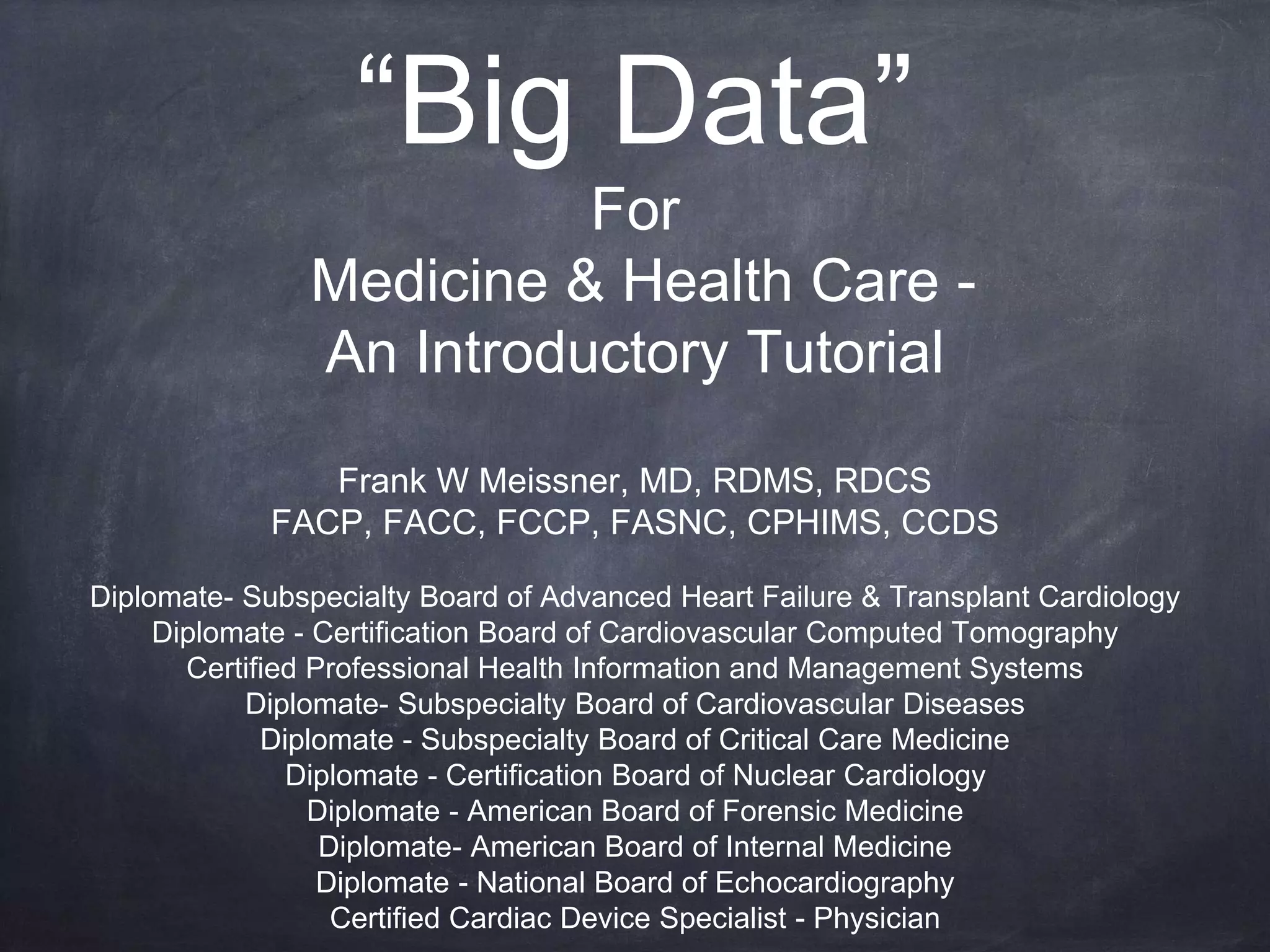 The document provides an introductory tutorial on 'big data' in medicine and healthcare, defining it as vast amounts of structured and unstructured data that can be analyzed for insights. It discusses the dimensions of big data, including volume, velocity, and variety, and contrasts traditional data warehouses with big data approaches using frameworks like Hadoop. Challenges and applications in the field are highlighted, as well as the need for new processing methods to gain meaningful insights from complex data sources.