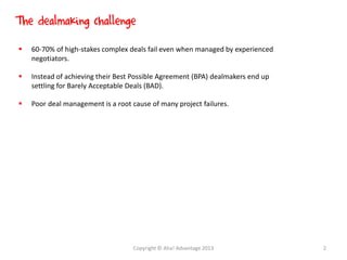 The document describes the DealNavigator program, which provides tools and guidance to help negotiate complex deals that involve multiple parties, competing interests, and high stakes. It notes that 60-70% of such deals fail or result in barely acceptable outcomes. DealNavigator addresses this with a five-stage negotiation process and other resources like playbooks, online tools, and training. The overall system aims to increase deal success rates by managing risks, aligning parties' interests, and keeping negotiations focused on an optimal outcome.