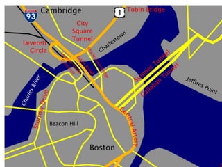 The Big Dig was the largest and most complex highway project in US history, intended to solve Boston's traffic problems and reconnect downtown to waterfront towns. It involved constructing 7.8 miles of highway with 161 lanes miles through tunnels under the city. Over 22 billion was spent excavating over 16 million cubic yards of soil and pouring 3.8 million cubic yards of concrete with 5,000 workers. The project faced construction issues like leaks in the tunnel from faulty fixtures that killed one person, and cost overruns increased the price from $2.6 to $22 billion with taxpayers paying half.