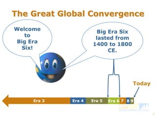 Global convergence from 1400 to 1800 led to accelerating changes worldwide. Ideas, goods, technologies, and pathogens spread further and faster as trade networks expanded. World population grew significantly due to improved nutrition, while disease devastated native populations in the Americas. States and empires grew larger and more powerful through conquests, colonization, and wealth from trade and manufacturing. Challenges to absolutist rulers emerged from new social elites and ideas about human rights and democracy. Overall, this era saw the world become more interconnected as it moved closer to the modern globalized world.