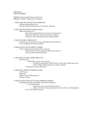 The document outlines a promotional campaign for a tea product called 'Releaf,' designed to redefine tea consumption by focusing on its beneficial aspects and providing a satisfying alternative to traditional bitter teas. It includes information on branding elements such as logo design, color palette, and communication strategies, aimed at targeting consumers aged 18-54 who may perceive tea negatively. The campaign will feature various marketing tactics, including a website, print ads, and interactive truck events, to engage consumers and promote the hashtag '#releaf.'