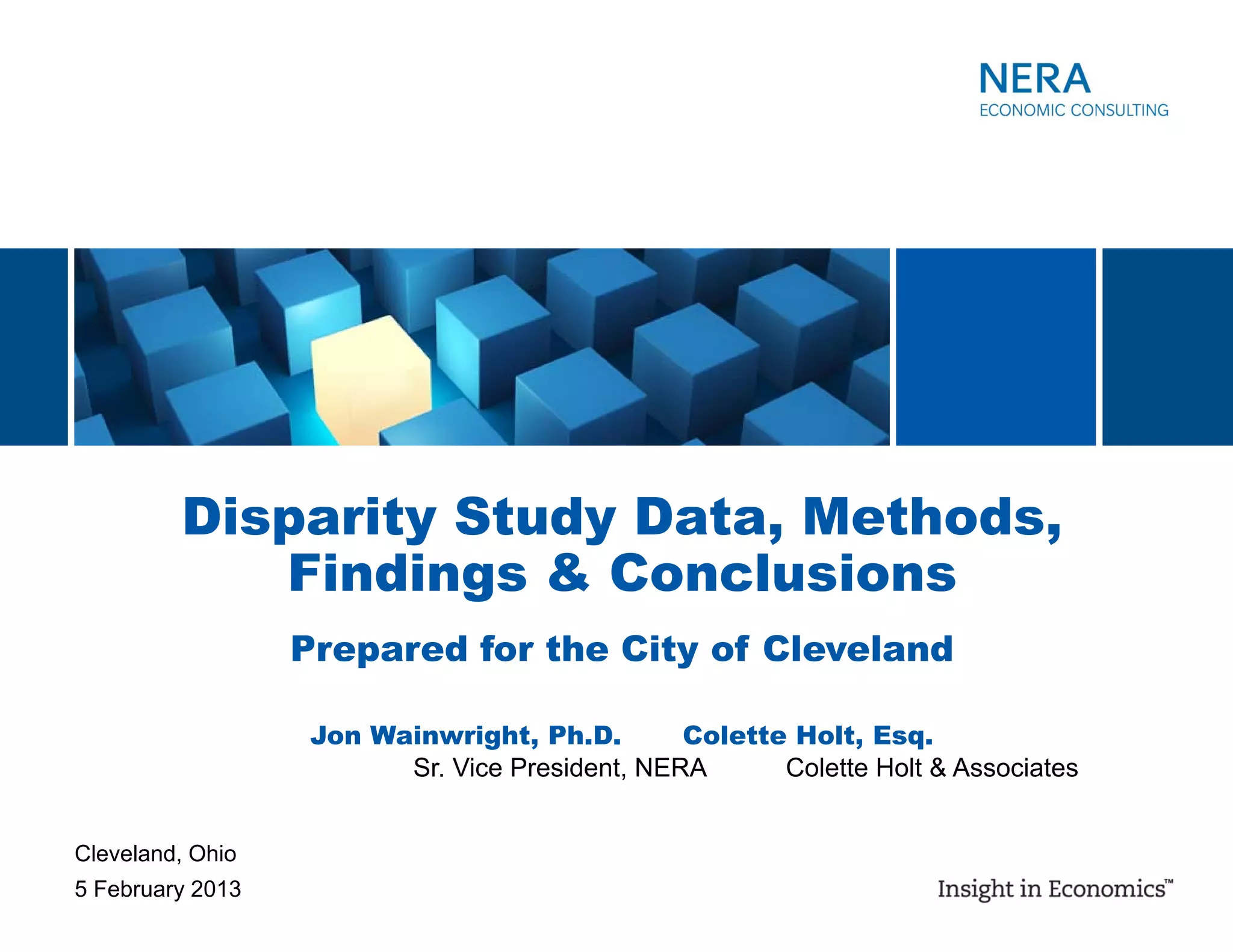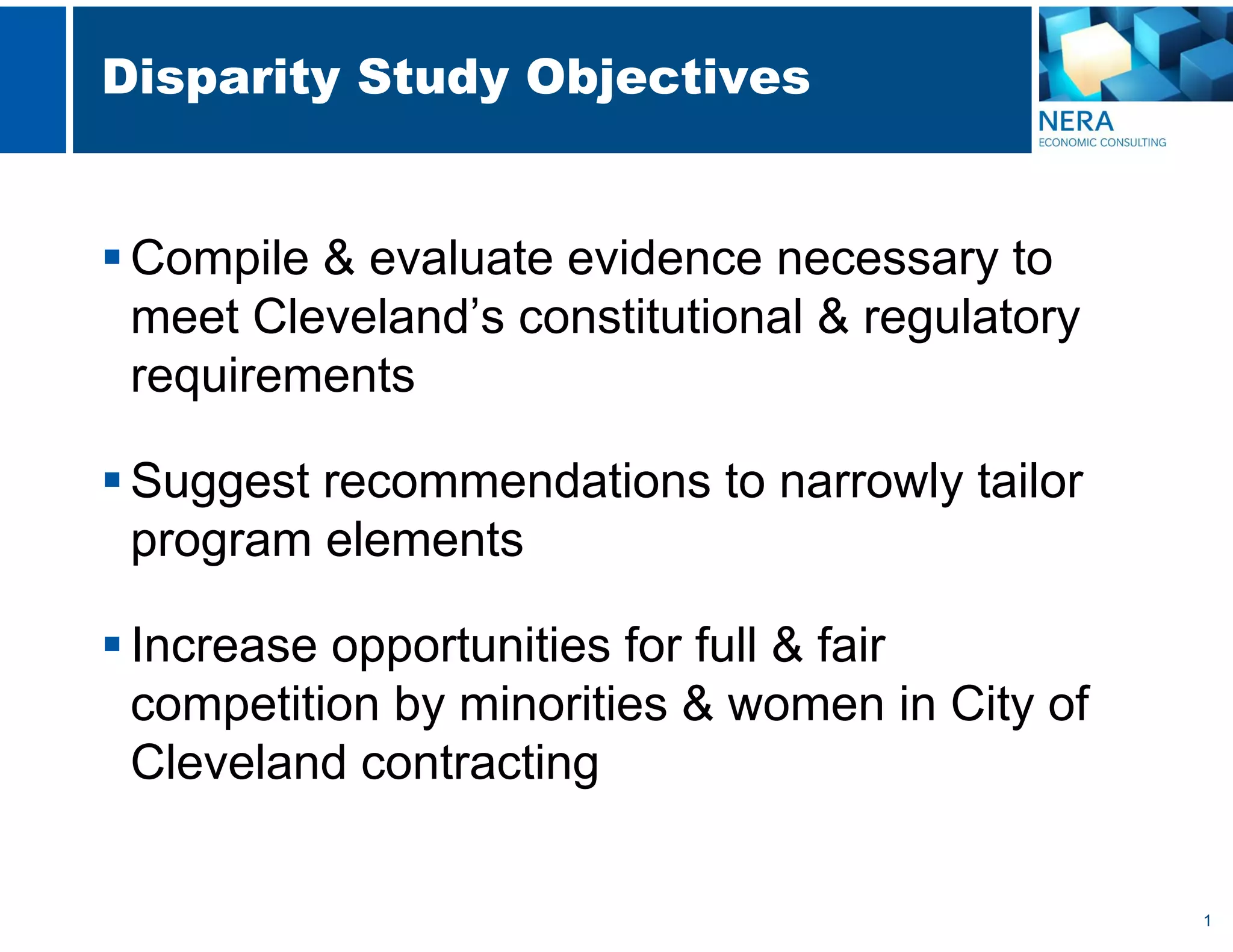 This disparity study examined contracting data and market conditions in Cleveland to determine if there is evidence of discrimination against minority- and women-owned firms. The study found disparities in many areas, including lower utilization rates, wages, business earnings, and loan approval rates. It provided recommendations to enhance current race- and gender-neutral initiatives and adopt new narrowly tailored race- and gender-conscious policies.