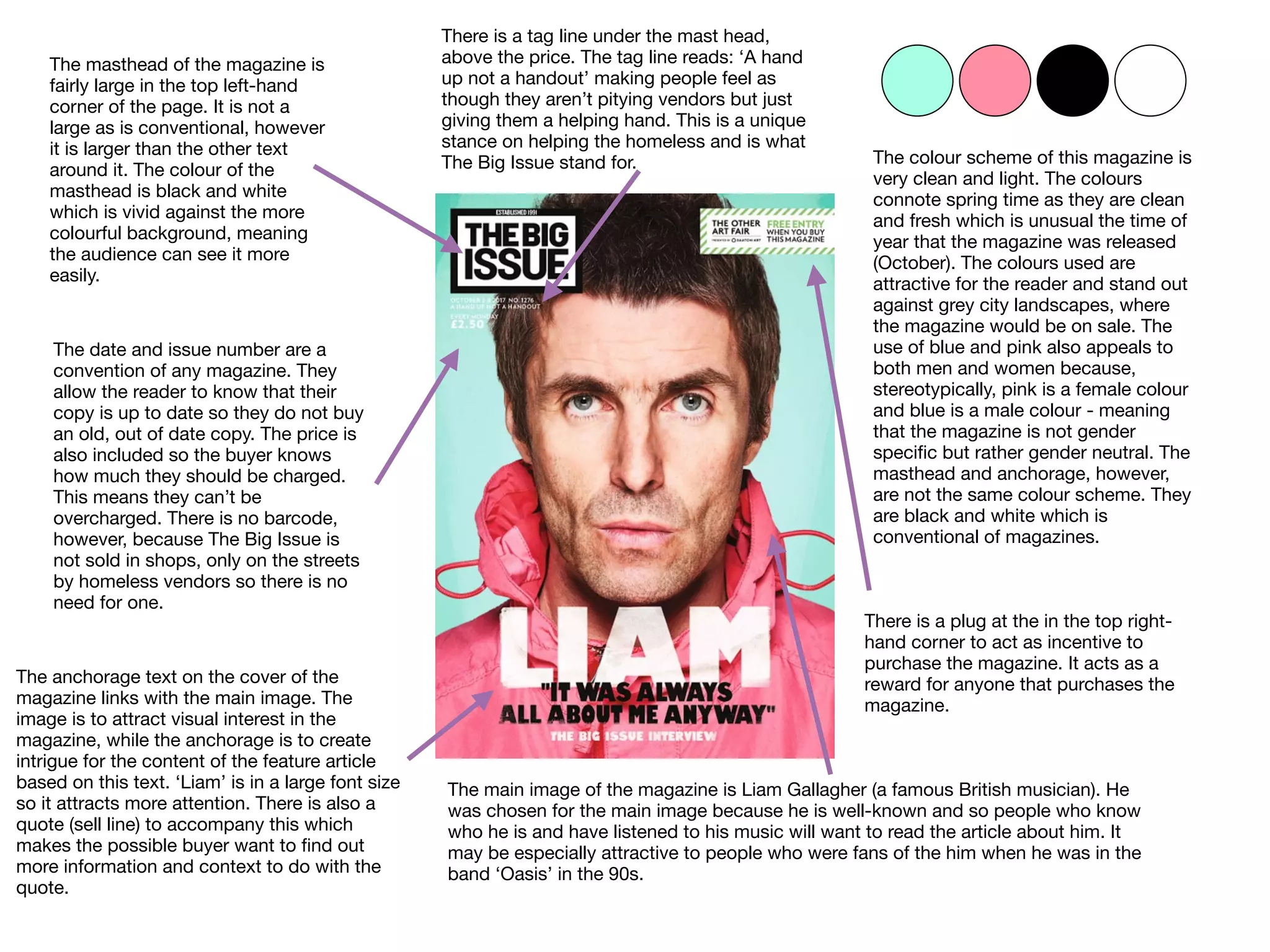 The document analyzes the cover design elements of three issues of The Big Issue magazine. It discusses the placement and design of the masthead, main image, anchorage text, date/issue number, price, and color scheme for each cover. The covers featured Liam Gallagher, Morrissey, and George Michael and were chosen to attract readers interested in those musicians. The analyses explain how each design element is used to attract and engage potential buyers.