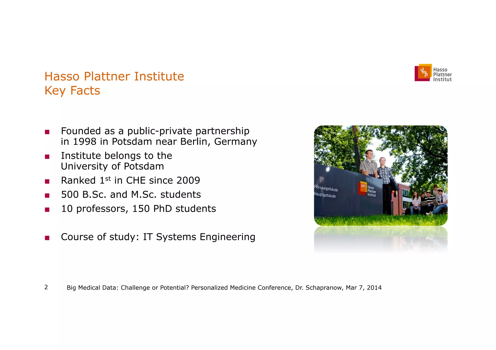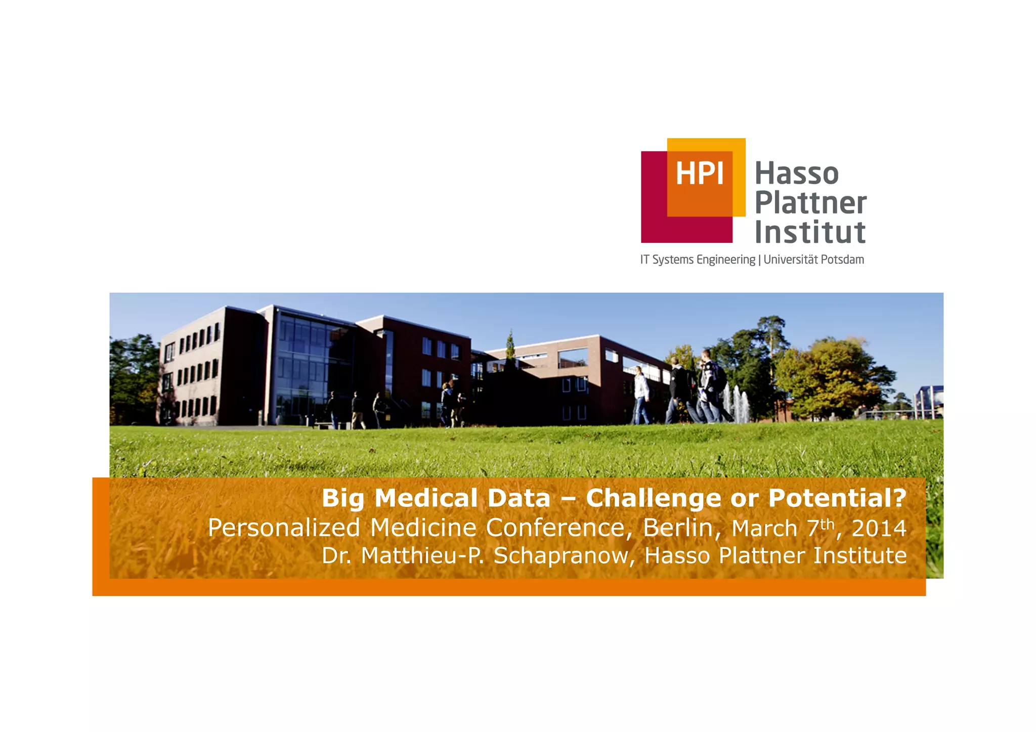 The document outlines a presentation by Dr. Matthieu-P. Schapranow at a personalized medicine conference, emphasizing the potential of big medical data and in-memory technology in enhancing personalized medicine. It highlights the capabilities of the Hasso Plattner Institute in utilizing integrated medical data for real-time genome analysis and efficient clinical decision-making. The presentation also discusses challenges related to data processing and the benefits of streamlined analytics to improve patient outcomes.