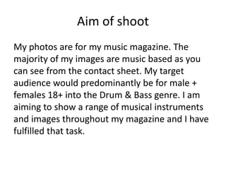 Joe Hayes took photos for his music magazine focused on the drum and bass genre. The majority of his images were music-based, as shown on his contact sheet. His target audience was predominantly males and females ages 18+ interested in drum and bass. He edited three photos - the first in black and white for an "old school" look targeting DJs ages 18-25, the second playing with color and contrast for a yellowy style, and the third with a green color. For his next project, he plans to take more photos to have a better selection, try different camera techniques beyond just depth of field, and diversify his subject matter.