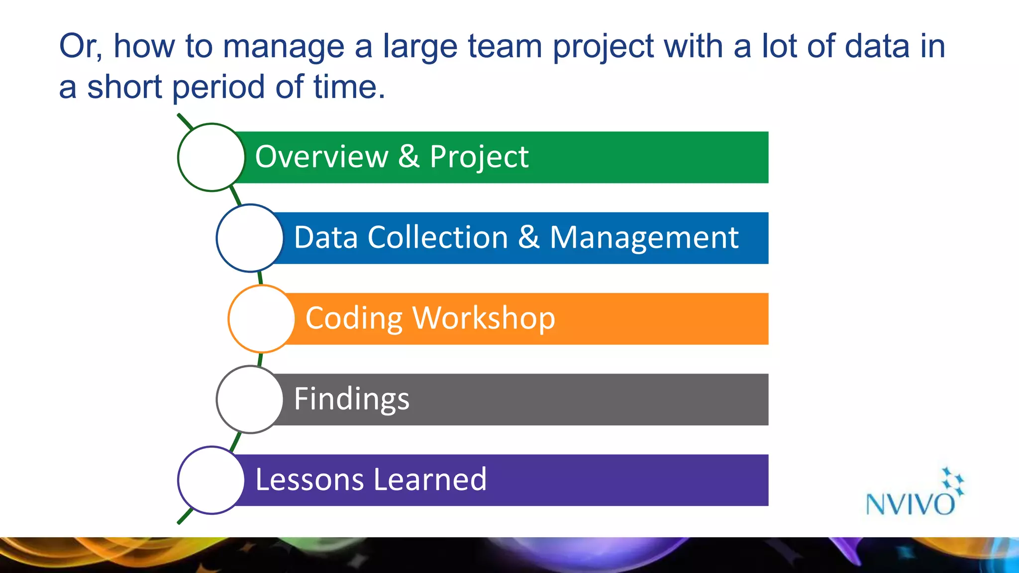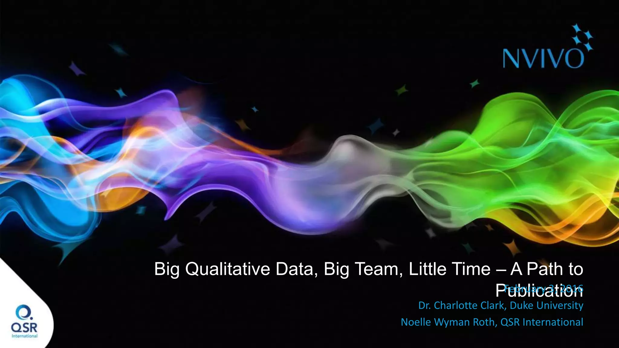 The document outlines a project by Dr. Charlotte Clark and Noelle Wyman Roth focusing on managing large qualitative data analysis using NVivo, with funding from the Bill and Melinda Gates Foundation. It details the project's aim to evaluate peer-to-peer interactions in writing within massive open online courses (MOOCs), the challenges faced by the team, and the findings related to student learning gains and attitudes in chemistry and English composition forums. The project emphasizes the importance of meticulous planning, team communication, and the iterative nature of qualitative data analysis.