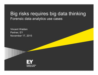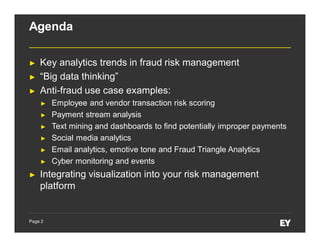 This document discusses forensic data analytics and its use in fraud risk management. It begins with an agenda on key analytics trends, "big data thinking," and examples of anti-fraud use cases like employee and vendor transaction risk scoring. The document then covers the forensic data analytics landscape, increasing regulatory focus on advanced monitoring, and how analytics can help improve compliance efficiency. It discusses challenges of forensic data analytics and integrating visualization into risk management platforms. The document concludes with success factors for deploying forensic data analytics like focusing on priority projects and gaining leadership support.