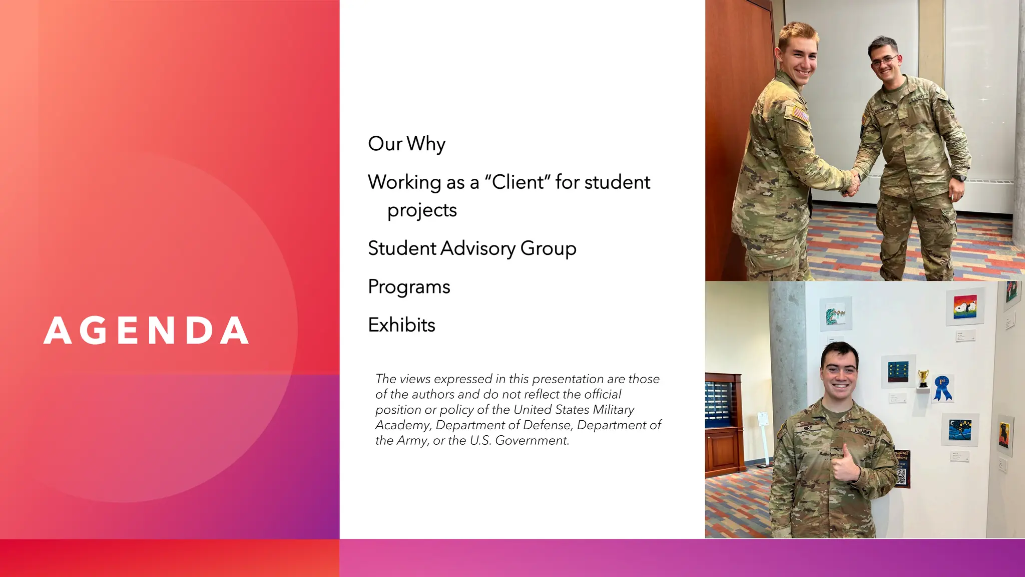 The document discusses leveraging student projects and organizations at the U.S. Military Academy to enhance cadet engagement and programming. It highlights the benefits of collaborative projects with students in various disciplines, the role of exhibitions in community building, and strategies for effective student involvement. Additionally, it emphasizes the importance of diversity, equity, and inclusion in achieving the academy's mission while fostering connections between cadets, alumni, and the community.