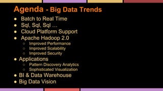 The document discusses trends in big data as presented at the 2013 AITP Region-5 Technical Conference, highlighting the shift from batch processing to real-time computing and the support of cloud platforms like Hadoop 2.0, which offers improved performance, scalability, and security. It mentions various tools for big data processing, applications of pattern discovery analytics, and the necessity for robust visualization capabilities. The presentation emphasizes the evolving landscape of big data concerning analytics, the role of business intelligence, and the need for organizations to adapt to new data sources and processing methods.