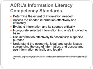 The document discusses using the BIG6 model to help students develop critical thinking skills related to information literacy. The BIG6 model involves 6 stages: 1) task definition, 2) information seeking strategies, 3) location and access, 4) use of information, 5) synthesis, and 6) evaluation. For each stage, the document provides guidance on activities and questions to help students develop skills such as determining information needs, finding and evaluating appropriate sources, extracting and organizing relevant information, and assessing both the problem-solving process and final product or learning outcomes. The overall goal is to prepare students for lifelong learning and contribution to various communities.