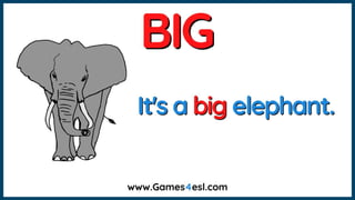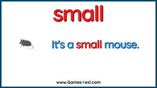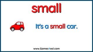 The document contains several comparisons asking if items are big or small. An egg, tree, and cat are described as small, while a dog, house, and car are described as big. A small giraffe is also listed as an unexpected example of something described as small.