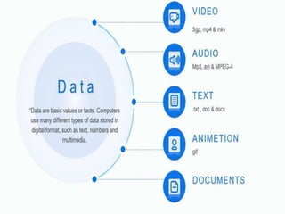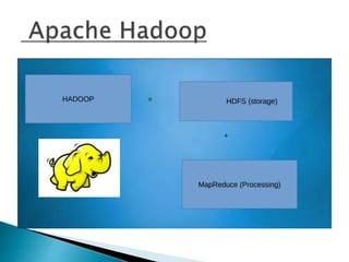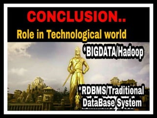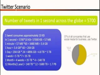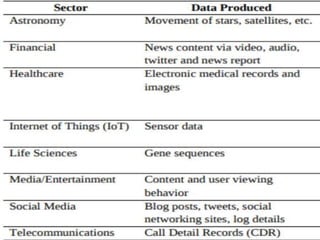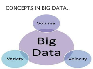 The document discusses key concepts related to big data including what data and big data are, the three structures of big data (volume, velocity, and variety), sources and types of big data, how big data differs from traditional databases, applications of big data across various fields such as healthcare and social media, tools for working with big data like Hadoop and MongoDB, and challenges and solutions related to big data.