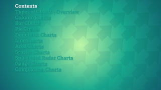 This document provides an overview of different types of charts used for data visualization, including column charts, bar charts, pie charts, doughnut charts, line charts, area charts, scatter charts, spider/radar charts, gauge charts, and comparison charts. It describes the purpose and use of each chart type, highlighting when each type is most effective to visualize different kinds of data relationships. The document aims to help readers select the most appropriate chart type based on their data and visualization goals.